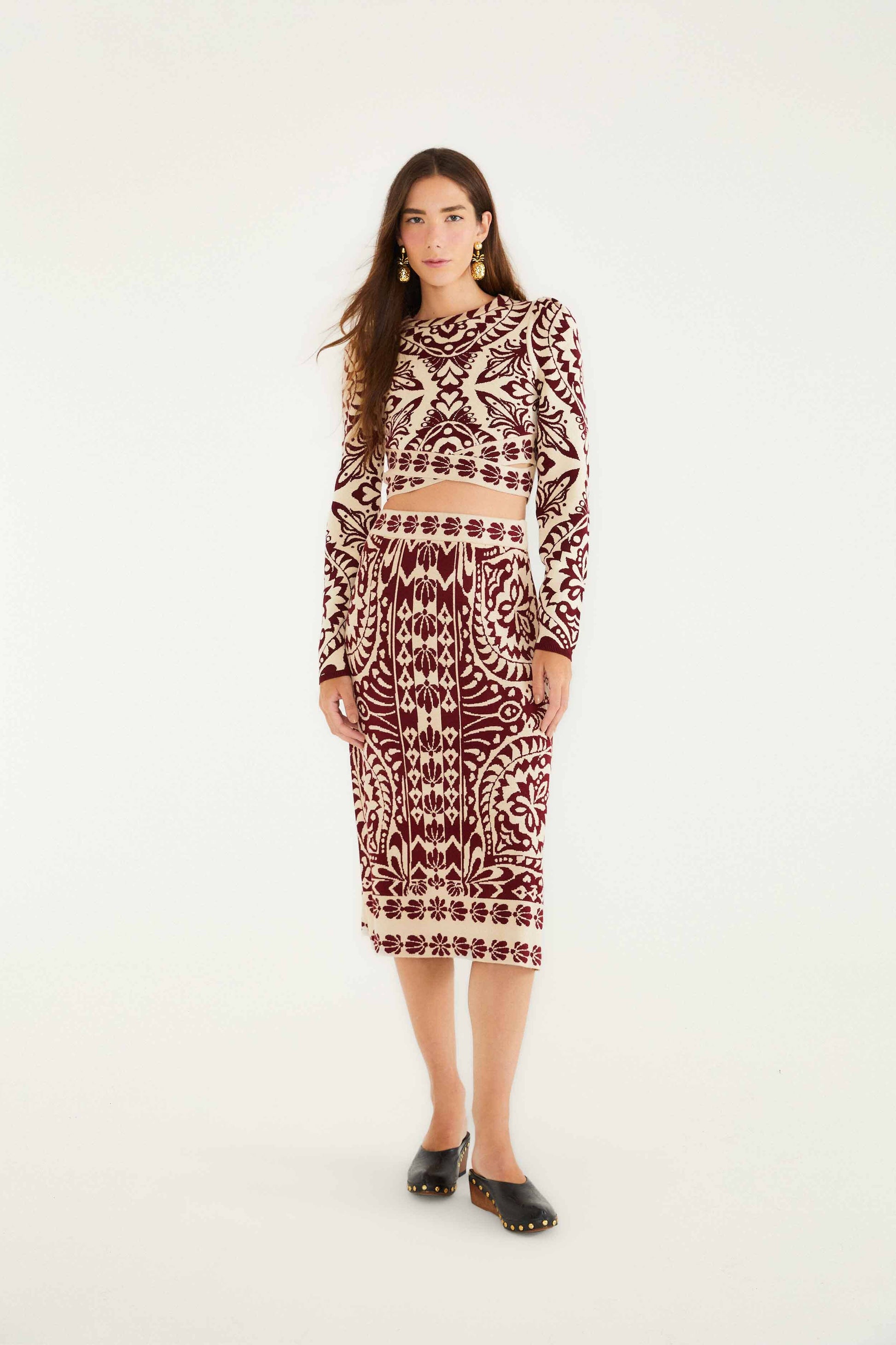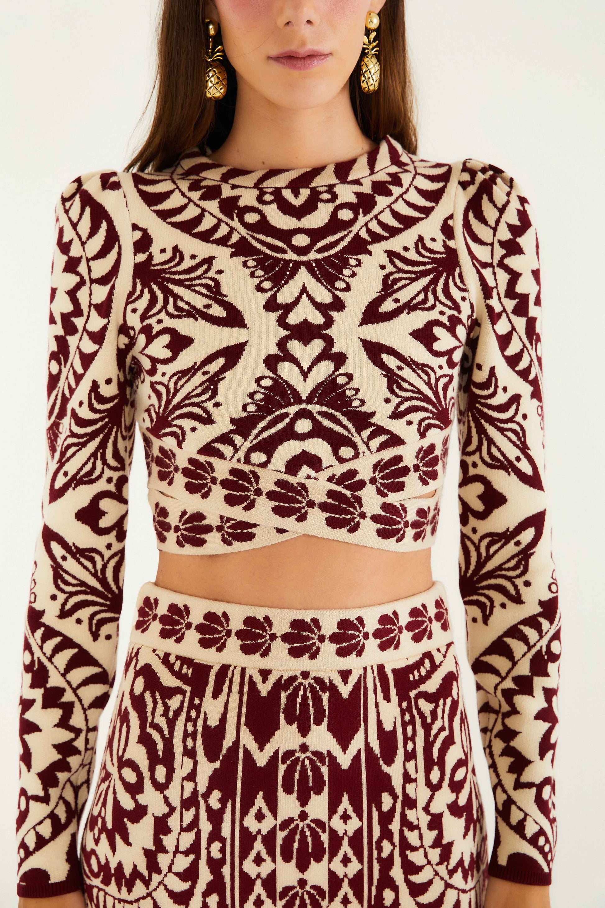 Embrace cozy elegance with the Burgundy Pineapple Love Knit Top, featuring a high neckline that frames the face with subtle charm. Its rich burgundy and cream hues craft a striking, intricate pineapple-inspired pattern that dances across the fabric. The cropped silhouette and delicately puffed shoulders add a playful yet refined touch, inviting warmth and a sense of joyful confidence into your everyday style.